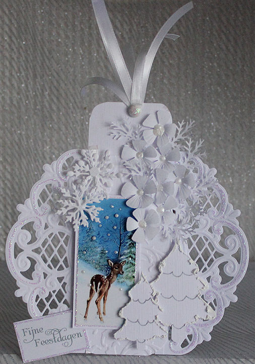Als snijmallen gebruikte ik LR0181(dennetak) en CR1358(bloemetje). Tot slot de stempel EC0156, een lintje en wat sterretjes.
